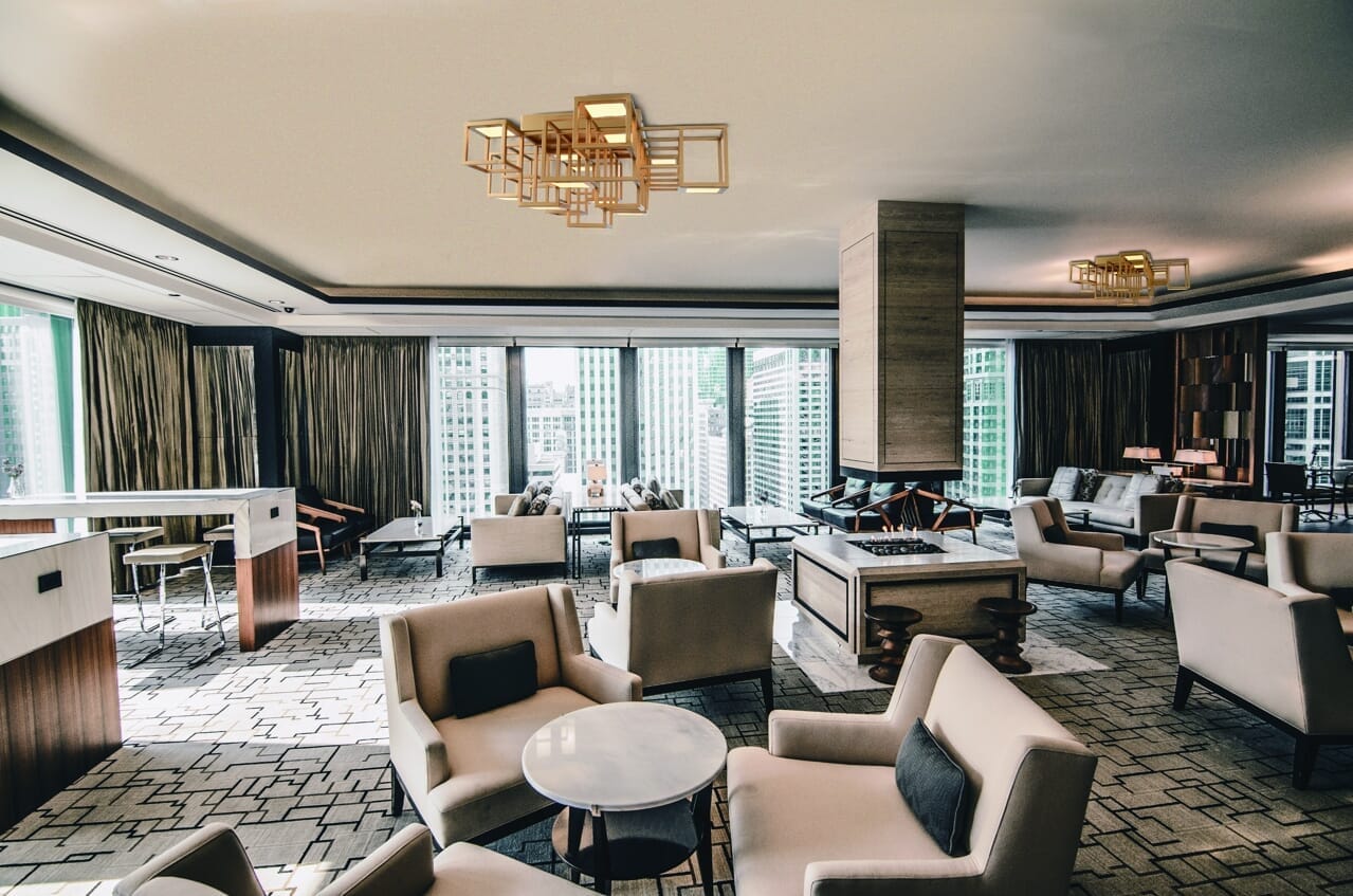 Inspired by shadow box wall art, multiple cubes outlined by plated-gold frames are positioned in dimensional patterns and illuminated by LED panels to create a dramatic visual effect.