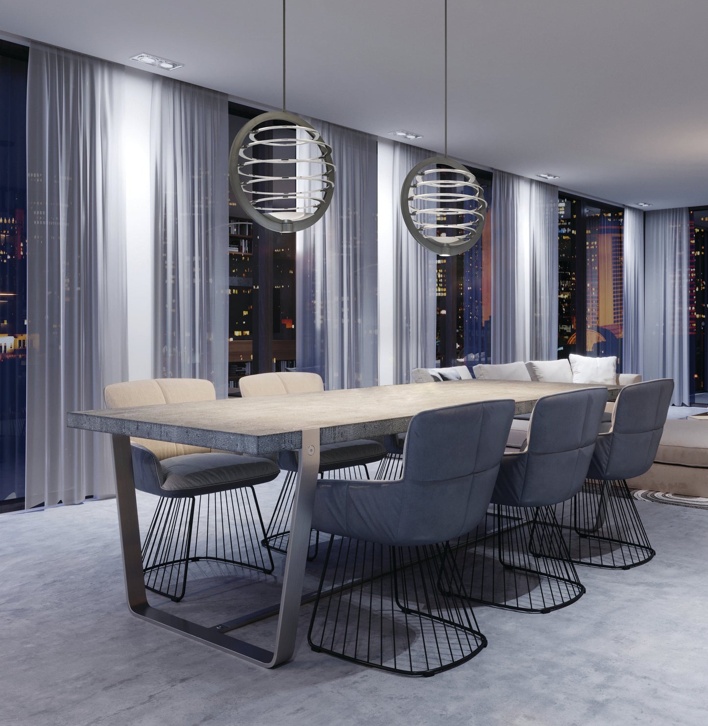 Indirect lighting is cast upward into circular blades discretely held by the outer frame while direct lighting is cast downward for a dramatic interplay of light and shadow.