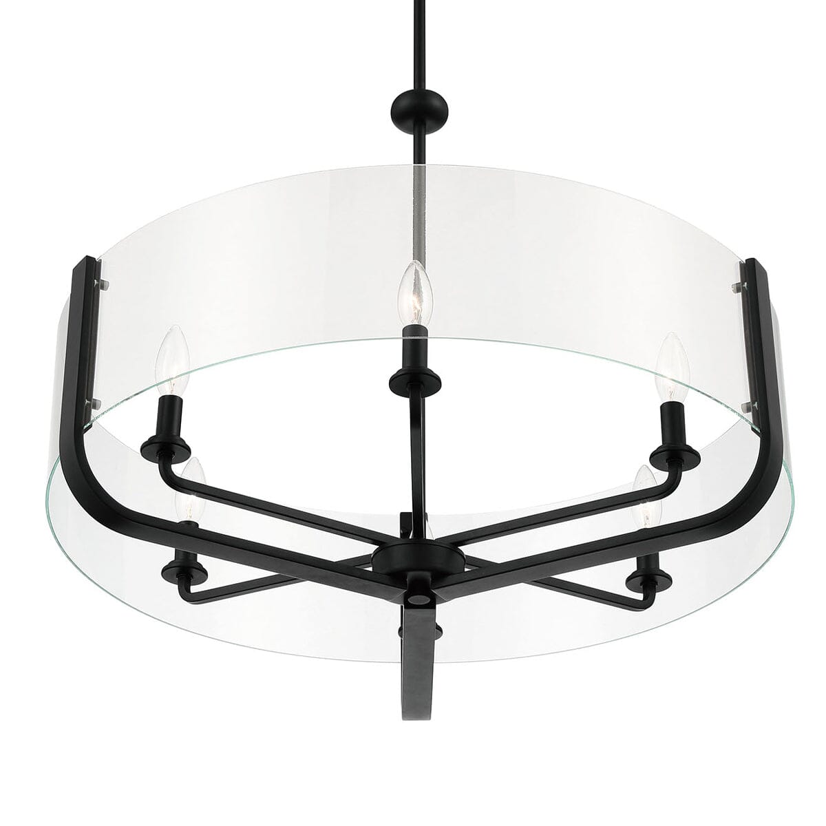 Hand-blown clear glass is seamlessly suspended by a simple frame, highlighting the charm of a candelabra in this transitional piece.